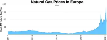 In 2021 natural gas prices in the European Union have risen as high as 800% from the beginning of the year. The dispute is over the Nord Stream 2 Gas pipeline and other disputes such as Yamal-Europe pipeline that usually sends Russian gas to Western Europe was flowing in reverse.[17]