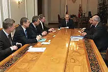 On 17 January 2009, Russia held an international gas conference in Moscow. The EU was represented by the Presidency, the Czech Minister of Industry and Trade Martin Říman, and the EU Energy Commissioner Andris Piebalgs, so that the European Union could speak with one voice.[98][99][100] Ukraine was represented by the Prime Minister Yulia Tymoshenko.[101] The conference did not achieve any solution to the crisis, and the negotiations continued bilaterally between Prime Ministers Putin and Tymoshenko. Early on 18 January 2009, after five hours of talks, Putin and Tymoshenko reached a deal to restore gas supplies to Europe and Ukraine.[102][103] Both parties agreed that Ukraine would start paying European prices for its natural gas, less a 20% discount for 2009, and that Ukraine would pay the full European market price starting in 2010. In return for the discounts for 2009, Ukraine agreed to keep its transit fee for Russian gas unchanged in 2009. The two sides also agreed not to use intermediaries.[104] On 19 January 2009, Gazprom CEO Alexei Miller and the head of Naftohaz Oleh Dubyna signed an agreement on natural gas supply to Ukraine for the period of 2009–2019.[105][106][107] Gas supplies restarted on 20 January 2009, and were fully restored on 21 January.[108]