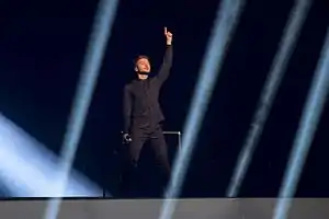 The Russian performance featured Sergey Lazarev performing in front of a projection screen that displayed 3D images that Lazarev interacted with.[27][28] Lazarev posed, climbed and laid in the middle of the projection screen as various effects were projected. Lazarev was dressed in a black costume and performed choreographed movements together with the backing performers, who were also dressed in black. The stage director for the performance was Fokas Evangelinos. On stage, Lazarev was joined by five backing vocalists/dancers: Jennie Jahns, Alvaro Estrella, Johan D. Seil, Daniel Gill and Adam Svensson.[29]