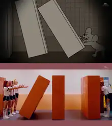 With its bright, sports-themed and colorful setting, the music video gained attention for its violent content hidden beneath a fun and playful song. While dressed in cute outfits, the members sing about a romantic relationship that they compare to a game of Russian roulette as they try to inflict harm on each other. Each member appear in various scenes dropping tennis balls, pianos, refrigerators, and lockers on the other girls, or even feeding the rest colored nuts and bolts instead of cereal. The video featured clips of Itchy & Scratchy, which is a fictional cartoon show and running gag on the American animated sitcom The Simpsons. These scenes were shown right before the members reenact the characters' actions, such as when they push a member in front of an oncoming car or into an empty swimming pool.[16] Sherly Tucci of The Daily Dot stated that the song's cheerful sound "juxtaposes the catastrophic and lethal pranks the girls play on each other" in the video where the members "show their dark side with stone-faced stares and subtle smirks".[17] Bradley Stern of PopCrush likened the black comedy in the video to the film Jawbreaker and said it's "pretty genius".[1] The Inquisitr said it utilized colorful visuals, entertaining video shots and plot settings, claiming that it is just as artistic as the music videos for their previous singles "Dumb Dumb" and "One of These Nights", although it "takes a slower pace than the former but quicker than the latter".[5] "Russian Roulette" became the most viewed k-pop music video for the month of September in America and worldwide.[18]