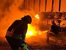 On 11 October, seven people were killed and 49 injured by missile strikes on Kyiv.[61] The Kyiv Metro's red line and the interchange node at Teatralna–Golden Gate were closed. Most underground stations continued to operate as bomb shelters.[46] Areas struck by missiles included a children's playground.[62] Fires broke out in six cars, and more than 15 cars were damaged.[63]