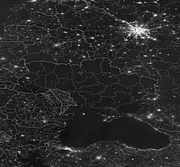 On 10 October 2022 Russia attacked the power grid throughout Ukraine, including the in Kyiv, with a wave of 84 cruise missiles and 24 suicide drones.[7] Further waves struck Ukrainian infrastructure, killing and injuring many, and seriously affecting energy distribution across Ukraine and neighboring countries. By 19 November, nearly half of the country's power grid was out of commission, and 10 million Ukrainians were without electricity, according to Ukrainian President Volodymyr Zelenskyy.[8][9] By mid-December, Russia had fired more than 1,000 missiles and drones at Ukraine's energy grid.[10] Several waves targeted Kyiv, including one on 16 May 2023 in which Ukraine said it had intercepted six Kinzhal missiles.