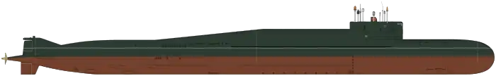 ![]() Line drawing showing the starboard side of K-114 Tula. The white cheatline marks the boat's waterline. |