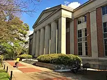 Located in the northwest corner, the Fine Arts Building was modeled in the neoclassical architectural style and built in 1941 with funds from the Public Works Administration, part of the New Deal initiated in the 1930s. The building covers an area about the size of a city block, and the interior features a giant mural by French-American artist Jean Charlot. At the time of its construction, it was the largest and most expensive academic building on campus.[119] The Zell B. Miller Learning Center became the largest academic building in Central Campus when it was built in 2003 with a footprint of 6.5 acres (2.6 hectares). With 26 classrooms and lecture halls and a total of 2,200 seats, the Learning Center is also probably the most heavily used by students. In 2009, the building was renamed in honor of UGA alumnus Zell B. Miller who went on to serve as the 79th Governor of Georgia and later as the U.S. Senator from Georgia.[120] Another heavily used building is the Dean Tate Student Center built in 1983 and expanded in 2009. The LEED Gold-certified building features a green roof and 75,000 gallon cistern to catch rainwater for use in irrigation and flushing toilets. The building was named after William Tate, the former dean of men.[121]