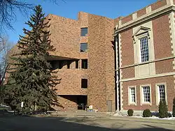 A new wing of the library was officially opened on September 27, 1974, by Mrs. Hazel McCuaig (Hazel Elizabeth Rutherford) and designated "Rutherford North". The distinctive brickwork of Rutherford North was designed by the architectural firm of Minsos, Vaitkunas and Jamieson in conformance with the structure of the original Rutherford Library. The Rutherford North design encapsulates and encloses the north face of the original building in a large open space. The new brick motif of Rutherford North was named "Rutherford Autumn Leaf" and registered in the building industry.