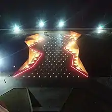 The monument features a bronze 25-metre statue of a soldier in the Red Army standing on a 10-metre mound. On the road leading to the mound, there are images of soldiers on broken walls situated on both sides, as well as the names of those who were killed in action during the battle.[5] Around 34 million rubles were allocated to the monument from the regional government,[6] alongside the 650 million rubles allocated by the Union States, the budget of the Russian government, and private donations.[7] The construction of the monument was also financed and supported by organizations such as Lukoil.[8] The image of a soldier dissolving in a flock of birds originates from the poem Zhuravli by Rasul Gamzatov, which became iconic thanks to its adaptation to music by Yan Frenkel.