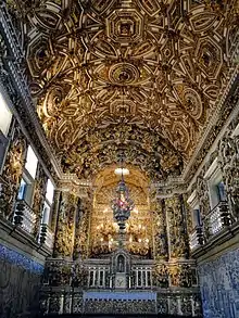 Blue-white tile (azulejo) panels, by Bartolomeu Antunes de Jesus and imported from Lisbon, cover the lower parts of the walls of the main chapel and transept and depict scenes of the life of St Francis of Assisi. The decoration of the church is considered one of the most complete and imposing in Portuguese-Brazilian Baroque gilt woodwork art (talha dourada), being a perfect example of the "golden church" (igreja dourada).[9][10]