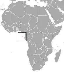 The São Tomé leaf-nosed bat is known only from the island of São Tomé in the Gulf of Guinea. It is described as not uncommon, and roosts of up to one hundred individuals have been found. In the absence of evidence to the contrary, and because no special threats have been identified, the International Union for Conservation of Nature has assessed the conservation status of this species as being of "least concern".[1]