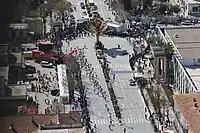 In the newly prosperous town a bath building was built, decorated with fine mosaics: its restoration in the fifth century had a cold room (frigidarium) paved with a large mosaic showing the birth of Venus.[4] On the northwest edge of the town two great Christian basilicas were built at the end of the fourth century, decorated, again, with splendid mosaics,[5] and a Bishopric was founded at this time. There was a Jewish community in the area.[6] The Romans built a circus at Sitifis, which aerial photographs show survived substantially intact until the 20th century; today only a small part of the curved end continues visible; the remainder has been destroyed or built over. In the 5th century it suffered from a violent earthquake.[7]