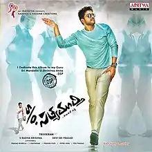 Trivikram's regular collaborator, Devi Sri Prasad, was hired for the music compostions. Folk singer Raghu Dixit made his Telugu cinema debut as a playback singer, saying on 4 February 2015 that he had recorded a song for the film.[5][6] The soundtrack was scheduled to be released on 18 March,[7] with Pawan Kalyan and Mahesh Babu the expected guests of honour at the release party.[8] In late February 2015, Prasad wrote and recorded a song.[9] Aditya Music acquired the soundtrack's marketing rights, and the seven-track list was released on 20 March 2015.[10] The complete album was released the following day, on 21 March 2015, coinciding with the Ugadi celebrations, on the H. I. C. C. Novotel Hotel in Hyderabad.[11] Kannada tracks of the film were released in 2020, including soundtrack album under Aditya Music label.