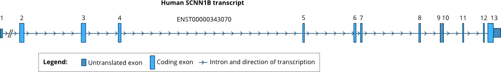 While the human gene SCNN1A is located in chromosome 12p,[12] the human genes encoding SCNN1B and SCNN1G are located in juxtaposition in the short arm of chromosome 16 (16p12-p13).[10] Sequencing of the human genomic DNA indicated that the SCNN1B gene has 13 exons separated by 12 introns.[11] The positions of introns are conserved in all three human ENaC genes, SCNN1A, SCNN1B and SCNN1G.[11] The positions of the introns are also highly conserved across vertebrates. See: Ensembl GeneTree.