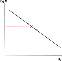 For a more accurate determination of the molecular weight, the relative migration distances of the individual protein bands are measured in the separating gel.[37][38] The measurements are usually performed in triplicate for increased accuracy. The relative mobility (called Rf value or Rm value) is the quotient of the distance of the band of the protein and the distance of the buffer front. The distances of the bands and the buffer front are each measured from the beginning of the separation gel. The distance of the buffer front roughly corresponds to the distance of the bromophenol blue contained in the sample buffer. The relative distances of the proteins of the size marker are plotted semi-logarithmically against their known molecular weights. By comparison with the linear part of the generated graph or by a regression analysis, the molecular weight of an unknown protein can be determined by its relative mobility.[37]