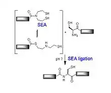 Protein chemical synthesis by native peptide ligation of unprotected peptide segments is an interesting complement and potential alternative to the use of living systems for producing proteins.[1] The synthesis of proteins requires efficient native peptide ligation methods, which enable the chemoselective formation of a native peptide bond in aqueous solution between unprotected peptide segments. The most frequently used technique for synthesizing proteins is Native chemical ligation (NCL). However, alternatives are emerging, one of which is SEA Native Peptide Ligation.