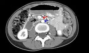 | Abdominal and pelvic computed tomography scan showing duodenal compression (black arrow) by the superior mesenteric artery (red arrow) and the abdominal aorta (blue arrow). | |