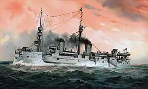 Following Diederichs's seizure of Jiaozhou Bay in November 1897, Deutschland, the protected cruiser Kaiserin Augusta, and the light cruisers Gefion and Cormoran reinforced the East Asia Cruiser Division. The arrival of the four ships allowed the division to be expanded to the East Asia Squadron.[17] Prince Heinrich, with his flag aboard Deutschland, departed Germany in December 1897 with Gefion; the two ships arrived in Hong Kong in March 1898. Prince Heinrich took the two ships on a tour of Asia, culminating in a state visit to Beijing in April.[18] While most of the Squadron went to the Philippines to safeguard German interests during the Spanish–American War in the summer of 1898, Deutschland, Gefion, and Irene remained in Chinese waters.[19] On 14 April 1899, Diederichs left the East Asia Squadron; command passed to Prince Henry and Deutschland became the Squadron flagship.[20]