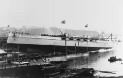 Prinz Eugen, the third ship of her class, was laid down in Trieste by Stabilimento Tecnico Triestino on 16 January 1912.[34][41] The budget agreement which funded Prinz Eugen stipulated that while the armor and guns of the battleship were to be constructed within Austria, the electrical wiring and equipment aboard the battleship was to be assembled in Hungary. Additionally, half of all ammunition and shells for the guns of the ship would be purchased in Austria, while the other half was to be bought in Hungary.[42] Despite two strikes by machinists in August 1912 and March 1913 which delayed construction of Prinz Eugen's engines, the battleship was built at a very fast pace.[43] Following just 11 months of construction, she was launched on 30 November 1912 in Trieste.[34][44]