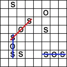 Before play begins, a square grid of at least 3×3 squares in size is drawn. Players take turns to add either an "S" or an "O" to any square, with no requirement to use the same letter each turn. The object of the game is for each player to attempt to create the straight sequence S-O-S among connected squares (either diagonally, horizontally, or vertically), and to create as many such sequences as they can. If a player succeeds in creating an SOS, that player immediately takes another turn, and continues to do so until no SOS can be created on their turn. Otherwise turns alternate between players after each move.[2][3]