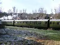 The policy under which the Southern Railway operated set trains continued into the Southern Region of British Railways; sets were disbanded and created as BR tried to create a new timetable.[2] Since 1949, the official livery for all main line coaches had been crimson and cream, in seven years the whole of the Southern Region fleet should be crimson and cream but that wasn't the case as many sets were still in Southern Railway malachite green.[2] In 1959, as the Kent Coast electrification scheme was completed most restriction '0' were withdrawn at the same time. This decline continued as BR had more modern Bulleid and Mark 1 coaching stock until 1967 where the last was withdrawn.[2] Many Maunsell coaches were sold by BR to heritage railways were they restored and operated.