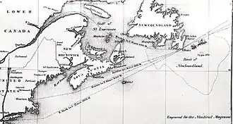 Arctic passed Cape Clear, at the southernmost point of Ireland, early on the morning of September 21, and entered the open Atlantic approaching her maximum speed of 13 knots (15 mph). In settled weather she progressed uneventfully, and early on September 27 had reached the Grand Banks, off the coast of Newfoundland.[26] This area is formed by a series of relatively shallow submarine plateaus forming part of the Canadian continental shelf.[27] Here, the sub-Arctic waters of the Labrador Current meet the warm northbound waters of the Gulf Stream to create weather systems typified by intermittent mists and fog.[28][29] It was the practice for steamers to maintain maximum speeds in these conditions, although before electronic aids to navigation the risk of collision was considerable. Keeping schedules was considered paramount, particularly in the Collins Line where, Alexander Brown states in his 1962 account, "there was no room for overcautious shipmasters".[30] On the morning of September 27, Luce observed typical Grand Banks conditions: "at intervals of a few minutes a very dense fog, followed by being sufficiently clear to see one or two miles."[31]