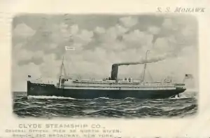 In 1907 Clyde Steamship Co. following an expansion of their business decided to increase the number of sailings between New York and southern ports of Charleston and Jacksonville to four per week. The majority of steamers operating on the route were of cargo type, and the company felt the need to order one new steamer to serve mainly as a passenger carrier between the ports.[2] At the time of her construction Mohawk was the largest and finest ship ever built for the Clyde Line and was laid down at the William Cramp & Sons' Kensington Yard in Philadelphia (yard number 349) and launched on 28 July 1908, with Mrs. J.S. Raymond, wife of the treasurer and assistant general manager of Clyde Steamship Company, serving as the sponsor.[3][4] The ship was primarily designed for passenger transportation and in addition to two decks, also had a hurricane or sun deck constructed on top. The vessel provided accommodations in single cabins or suites for 275 cabin and 60 steerage passengers, and had all the staterooms and saloons located on the upper decks. In addition, a café, and a spacious dining hall with a capacity to seat 110 people simultaneously, and open 24 hours a day, were built. A lounge, a reading room, a musical room, and smoking rooms were also constructed to provide entertainment for the would be passengers. Mohawk had electric lights in cabins and along the decks, and was also equipped with wireless of Marconi type. The vessel had also all the modern machinery fitted for quick loading and unloading of the cargo, including a large number of derricks.