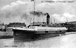During World War I and until 1919, Nomadic was requisitioned by the French government, and she saw service as an auxiliary minesweeper, also ferrying American troops to and from the harbour in Brest (France).[1] After the war, she returned to her tendering duties,[2] but in 1927 she was sold and continued to tender under the ownership of the Compagnie Cherbourgeoise de Transbordement.