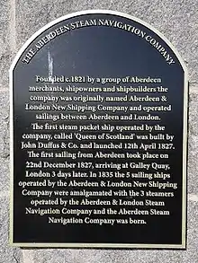 - ↑ W. Hamish Fraser, Clive Howard Lee Aberdeen, 1800-2000: A New History 1862321086 2000 - Page 76 "The others were all smaller concerns, of which the best known was John Duffus & Co. A later, but ... This was a wooden-hulled coastal paddle steamer, the Queen of Scotland, built for the Aberdeen Steam Navigation Co. Aberdeen's first ..."