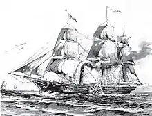 SS Savannah was an American hybrid sailing ship/sidewheel steamer built in 1818. She was the first steamship to cross the Atlantic Ocean, transiting mainly under sail power from May to June 1819. In spite of this historic voyage, the great space taken up by her large engine and its fuel at the expense of cargo, and the public's anxiety over embracing her revolutionary steam power, kept Savannah from being a commercial success as a steamship. Originally laid down as a sailing packet, she was, following a severe and unrelated reversal of the financial fortunes of her owners, converted back into a sailing ship shortly after returning from Europe.[2]