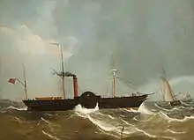 On Thursday 31 December 1846, when on charter to the Liverpool and Belfast Company and under the command of Captain William Gill, she collided with the Admiralty Steam Vessel Urgent and damaged a paddle box. The collision occurred in the River Mersey, in the vicinity of the Formby Lightship.[8] Captain Gill was exonerated by the directors: the accident occurred in dense fog. It is noted in the Company minutes, that a provision of £386 (equivalent to £39,767 in 2021)[9] was to be set aside to meet repairs to the damage suffered by the vessel. This did not prevent the directors from later claiming £2,004 (equivalent to £206,460 in 2021)[9] in compensation for damage and loss of earnings, and then, on legal advice, settling for £1,489. On 22 February 1848, she collided with the brig William. One of the vessels lost her bowsprit, jib-boom and bulwarks.[10] On 21 December 1854, she struck steps at the Prince's Pier, Liverpool, severely damaging her starboard paddle box and forcing the cancellation of her sailing to the Isle of Man.[11] In December 1863, she was in collision with the Naval brig Wild Wave, the settlement after a long wrangle costing the Steam Packet £1,128 (equivalent to £116,211 in 2021).[9]