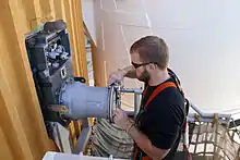 The two SRBs were designated as flight set 122 by contractor Alliant Techsystems and were made up from one new segment and remaining segments reused across 54 earlier shuttle missions dating back to STS-1.[28] Inside the VAB, engineers attached a large sling to Discovery and the orbiter was rotated vertically. The orbiter was lifted into the high bay where its external tank (ET-137) and boosters were waiting to be mated. During the mating operations, an internal nut pre-positioned inside the aft compartment of the orbiter slipped out of position and fell away inside the compartment.[29] Engineers initially were worried that the orbiter would have to be removed from the ET and placed back in a horizontal orientation to make repairs. However, later they successfully accessed the area inside the aft compartment, and re-positioned the nut to complete the repairs. The bolting of the orbiter to its ET ('hard mate') was completed early on the morning of September 11, 2010, at 09:27 EDT.