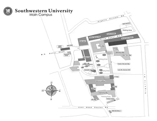 Southwestern University is in the south of the City of Cebu, Philippines. The university has two campuses. The main campus is located on Urgello St. and the Aznar Coliseum Complex is on Aznar Road, just some 200 meters away from the main campus.