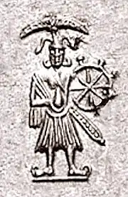 ![]() Saṃkarṣaṇa on a coin of Agathocles of Bactria, c. 190-180 BCE.[1][2] This is "the earliest unambiguous image" of the deity.[3][4] | |