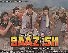 Saazish is a 1988 Indian Hindi-language film directed by Rajkumar Kohli, starring Raaj Kumar, Mithun Chakraborty, Raj Babbar, Dimple Kapadia, Anita Raj, Vinod Mehra, Kader Khan and Amrish Puri.[1][2]