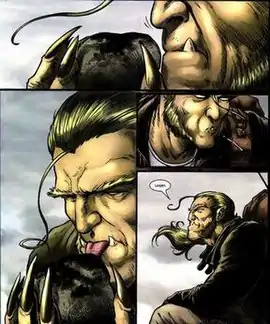 Sabretooth appears to Wolverine, leashed and under the control of the Devil himself, who has claimed to have broken Victor's will.[64] Victor shows defiance by striking the face of his defeated master after Wolverine uses his broken bone claws to pin the Devil to a wall.[65] After Wolverine has an interrupted discussion with his father, it is shown that Victor wields the Devil's sword, which is being held as a symbol of who is the ruler of Hell. Wolverine fights Victor again, mentioning, as he beheads him once more, that there is no coming back when someone is killed by the sword. Wolverine leaves Victor's beheaded soul lying in the pit of Hell.[66]