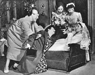 The co-author, Philip King, had written an earlier hit comedy, See How They Run (1945), and had collaborated with Falkland Cary on five plays.[1] Their Sailor Beware! was first produced by the Worthing repertory company in 1954. The cast included Peggy Mount and Richard Coleman, who retained their original roles when the play was presented at the Strand Theatre, London the following year.[2] The success of the West End production established Coleman as "a reliable and good-looking juvenile lead", according to The Times,[3] and Mount became what The Daily Mirror called "The toast of the town … the actress London is raving about".[4] Tessie O'Shea replaced Mount towards the end of the run. The play ran at the Strand until 22 February 1958, a total of 1,231 performances.[5]