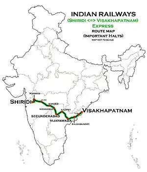 It operates as train number 18504 from Sainagar Shirdi to Visakhapatnam and as train number 18503 in the reverse direction serving the states of Maharashtra, Telangana & Andhra Pradesh. The train covers the distance of 1,400 km (870 mi) in 27 hours 15 mins approximately at a speed of (51 km/h (32 mph)).[1]
