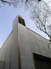 The church's bell tower acts as a landmark for itself and the parish. It is slightly higher than the façade and on the same alignment, which is a difference from other new churches in Paris such as Notre-Dame-de-l'Arche-d'Alliance in the 15th arrondissement and Notre-Dame-de-la-Sagesse in the 13th.