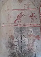 The "Christianisation" of the Thracian horseman iconography can be traced to the Cappadocian cave churches of Göreme, where frescoes of the 10th century show military saints on horseback confronting serpents with one, two or three heads. One of the earliest examples is from the church known as Mavrucan 3 (Güzelöz, Yeşilhisar), generally dated to the 10th century,[10] which portrays two "sacred riders" confronting two serpents twined around a tree, in a striking parallel to the Dioskuroi stela, except that the riders are now attacking the snake in the "tree of life" instead of a boar. In this example, at least, there appear to be two snakes with separate heads, but other examples of 10th-century Cappadocia show polycephalous snakes.[4] A poorly preserved wall-painting at the Yılanlı Kilise ("Snake Church") that depicts the two saints Theodore and George attacking a dragon has been tentatively dated to the 10th century,[11] or alternatively even to the mid-9th.[12]
