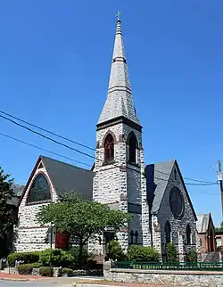 The present church building, built in 1872, was an American adaptation of the Oxford Movement in sanctuary design. Other features included coursed rows of rough-hewn blue limestone with stringcourses, sills and lintels of brownstone, stained-glass Gothic windows; and a bell tower with a stone steeple. Two heavy oak doors, painted red, are covered with elaborate scrolled pattern in bronze reminiscent of the Lichfield Cathedral in England. The foyer at the tower's base is decorated in the Arts & Crafts style, the ceiling have sixty small six-point stars cut into the ceiling and illuminated from above.[6] In December 1871, a fire in the town's business district destroyed the Federalist style sanctuary built in 1832 at the corner of Jonathan and Antietam Streets. The initial sanctuary space was sparsely, but tastefully, accommodated.
