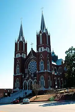 The towers are the tallest twin towers in Macon, and the 3rd tallest building in Macon, at 200 feet (61 meters) to the tip. The interior features 60 stained glass windows which teach the story of Salvation, a white Carrara marble altar and pulpit, and an organ with 1,000 pipes.[3]