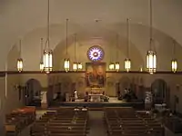 Because the parish church was founded prior to the Second Vatican Council, the church contains a high altar, behind which the large portrait of St. Joseph served as a reredos. These two features were common though by no means universal at that time (see ad orientem). The altar rails have since been removed, allowing easier access to the laity who now participate in the celebration of the Mass.