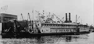 The boat was built by the Dravo Contracting Co. of Pittsburgh, Pennsylvania in 1932. She was Hull #1139 and weighed 947 tons.[2] The Sainte Genevieve had a steel hull and a superstructure of wood with steel for strengthening. Between 1963 and 1973, 97% of her hull bottom and 71% of her sides were replated.[3] Her paint scheme of grey and ivory with trim colours of dark red, black, and grey was consistent Mississippi River to keep it open to barge traffic.[4] She was the last sternwheel vessel and the last steam-powered dredge operated by the Corps when she retired in 1984.[3] She was given to the city of Davenport for use as a tourist attraction. Plans were to turn her into a dockside restaurant, a floating museum, or a bed and breakfast. Those plans were never realized, and she left Davenport in October 1990 for a new home on the Missouri River in St. Charles, Missouri, where there were plans to turn her into a museum, but that plan never materialized. The Sainte Genevieve sank in 1992 near Cairo, Illinois. She was raised and sank again in Cape Girardeau, Missouri in 1994. She was reportedly scrapped.[4] The vessel was delisted from the National Register of Historic Places in 2019.[5]
