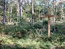 Sajevce is the location of one of two known mass graves in the Krakovo Forest associated with the Second World War. The sites consist of 10 large mounds and contain the remains of an undetermined number of Croatian prisoners of war, civilians, and possibly German soldiers as well. The Krakovo Forest 1 Mass Grave (Slovene: Grobišče Krakovski gozd 1) is located in the woods about 250 meters (820 ft) northeast of the Ponikvar farm.[7] The grave site was created simultaneously with the Krakovo Forest 2 Mass Grave (Slovene: Grobišče Krakovski gozd 2) in neighboring Kostanjevica na Krki.[8] The two sites were created around May 15, 1945, when Partisan forces captured about 4,000 Croatian soldiers and civilians at Dobruška Vas fleeing toward Austria. They were held on the left bank of the Krka River and killed in the forest over the course of a few days; eyewitnesses stated that the victims included children, women, and elderly persons.[9]