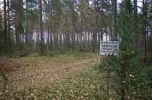 Sakalovapalo burial mounds is an ancient burial ground, a cemetery in Obinitsa village, Setomaa Parish, Võru County in southeastern Estonia. A stone cross used to be located near the burial mounds and the place was important and well known for the people in the region. The stone cross was destroyed during Soviet rule; many other burial mounds were also destroyed during the same period, as the sand from the mound was used on the roads nearby for antiskid treatment. The cross was a donation place, where passersby brought money, buttons, strings of yarn and other things. Red and white ribbons were tied to the bushes near the cross. People in the former times thought that the mounds date back to the Great Northern War or Swedish Rule and told stories of great battles in connection with the mounds.[1] The mounds have been examined in different times by different archaeologists. In 1913, the excavations were done by Russian geologist V. Kreiton. K. Mark, E. Astel, E. Richter, J. Linnus and many others have also done excavations in the mounds. The cemetery might have initially had up to 50 sand mounds. 36 of them have been preserved, 8 of which are extended mounds and 28 are round mounds. The mounds are so far the oldest archaeological relics in Obinitsa area.[2]