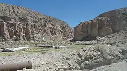 After being joined by the two streams before mentioned, the Salado River enters in a floodplain area, which is used for pasturage by the inhabitants of the nearby localities, including Toconce, Caspana and Aiquina. Then, the Salado again flows through a narrow canyon, where is found the so-called Devil's Bridge, a cut through rhyolite terrain of 5 m wide.
