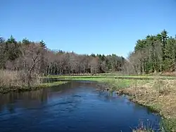 Salmon Brook begins at the outlet of Lower Massapoag Pond near the center of Dunstable.[1] It then flows approximately 9.3 miles (15.0 km) north-northeast to the Merrimack River. The water body farthest upstream in the watershed is Martins Pond just east of the center of the town of Groton. The outlet, Martins Pond Brook, runs southeast to Lost Lake/Knops Pond, the start of a chain of lakes that includes Whitney Pond, Cow Pond, and Upper and Lower Massapoag ponds. All of these water bodies are dammed. Salmon Brook runs roughly parallel to the Nashua River for its entire course from Lower Massapoag Pond to the Merrimack River.