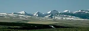 Several major tributary streams provide much of the flow of Salmon Falls Creek as well. The largest tributary is Shoshone Creek, which flows west from the Sawtooth National Forest and enters just upstream of the town of Jackpot. Cottonwood, China, Big, House, Jakes, and Cedar Creeks are some of the other perennial streams in the basin. Since Cedar Creek Reservoir was impounded in 1905, water no longer flows down the creek, whose course is mostly within Idaho. The southern portion of the watershed harbors many springs escaping from the foothills of the mountains, feeding the upper tributary streams.[8] The lower Salmon Falls Creek forms part of the boundary between the Eastern Snake River Plain Aquifer and Western Snake River Plain Aquifer.[9] Most of the southern basin lies between the Jarbidge Mountains and Granite Range on the west and the Sawtooth Mountains on the east, with many peaks rising to 10,000 feet (3,000 m) or more.[10]