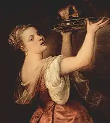 Salome, in Jewish history, was the name borne by three women of the Herod dynasty. Titian depicts the daughter of Herodias by her first husband Herod Philip. She was the wife successively of Philip the Tetrarch and Aristobulus, son of Herod of Chalcis. This Salome is the only one of the three who is mentioned in the New Testament,[1] and only in connection with the execution of John the Baptist. Herod Antipas, pleased by her dancing, offered her a reward "unto the half of my kingdom"; instructed by Herodias, she asked for John the Baptist's "head in a charger".[2]