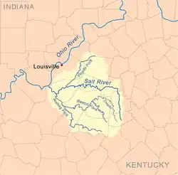 The Salt River is a 150-mile-long (240 km)[2] river in the U.S. state of Kentucky that drains 2,920 square miles (7,600 km2). It begins near Parksville, Kentucky, rising from the north slope of Persimmon Knob south of KY 300 between Alum Springs and Wilsonville, and ends at the Ohio River near West Point. Taylorsville Lake is formed from the Salt River, and Guist Creek Lake is also in its drainage basin.
