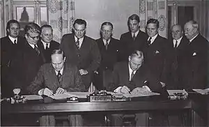 ![]() Signing of the Saltsjöbaden Agreement. August Lindberg of LO sitting to the left and Sigfrid Edström of SAF sitting to the right. | |
