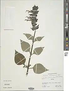 Salvia atrocyanea is a herbaceous perennial plant that is native to Bolivia. It grows to 1.75 m (5.7 ft) tall, with bright blue flowers that are tightly packed on drooping inflorescences as long as 50 cm (20 in). It has large green calyces and blue-tinged bracts.[1]